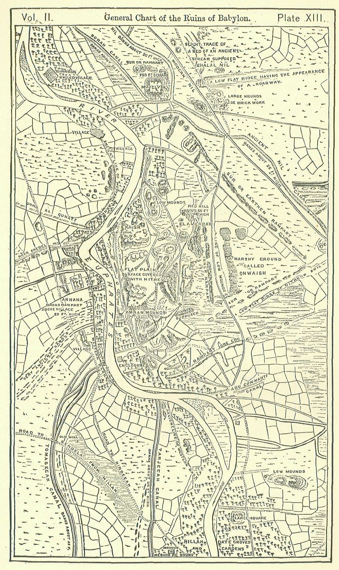 The limits of Babylonia Proper, the tract in which the dominant power of the Fourth Monarchy had its abode, being almost identical with those which have been already described under the head of Chaldaea, will not require in this place to be treated afresh, at any length. It needs only to remind the reader that Babylonia Proper is that alluvial tract towards the mouth of the two great rivers of Western Asia—the Tigris and the Euphrates—which intervenes between the Arabian Desert on the one side, and the more eastern of the two streams on the other. Across the Tigris the country is no longer Babylonia, but Cissia, or Susiana—a distinct region, known to the Jews as Elam—the habitat of a distinct people. Babylonia lies westward of the Tigris, and consists of two vast plains or flats, one situated between the two rivers, and thus forming the lower portion of the "Mesopotamia" of the Greeks and Romans—the other interposed between the Euphrates and Arabia, a long but narrow strip along the right bank of that abounding river. The former of these two districts is shaped like an ancient amphora, the mouth extending from Hit to Samarah, the neck lying between Baghdad and Ctesiphon on the Tigris, Mohammed and Mosaib on the Euphrates, the full expansion of the body occurring between Serut and El Khithr, and the pointed base reaching down to Kornah at the junction of the two streams. This tract, the main region of the ancient Babylonia, is about 320 miles long, and from 20 to 100 broad. It may be estimated to contain about 18,000 square miles. The tract west of the Euphrates is smaller than this. Its length, in the time of the Babylonian Empire, may be regarded as about 350 miles, its average width is from 25 to 30 miles, which would give an area of about 9000 square miles. Thus the Babylonia of Nabopolassar and Nebuchadnezzar may be regarded as covering a space of 27,000 square miles—a space a little exceeding the area of the Low countries.