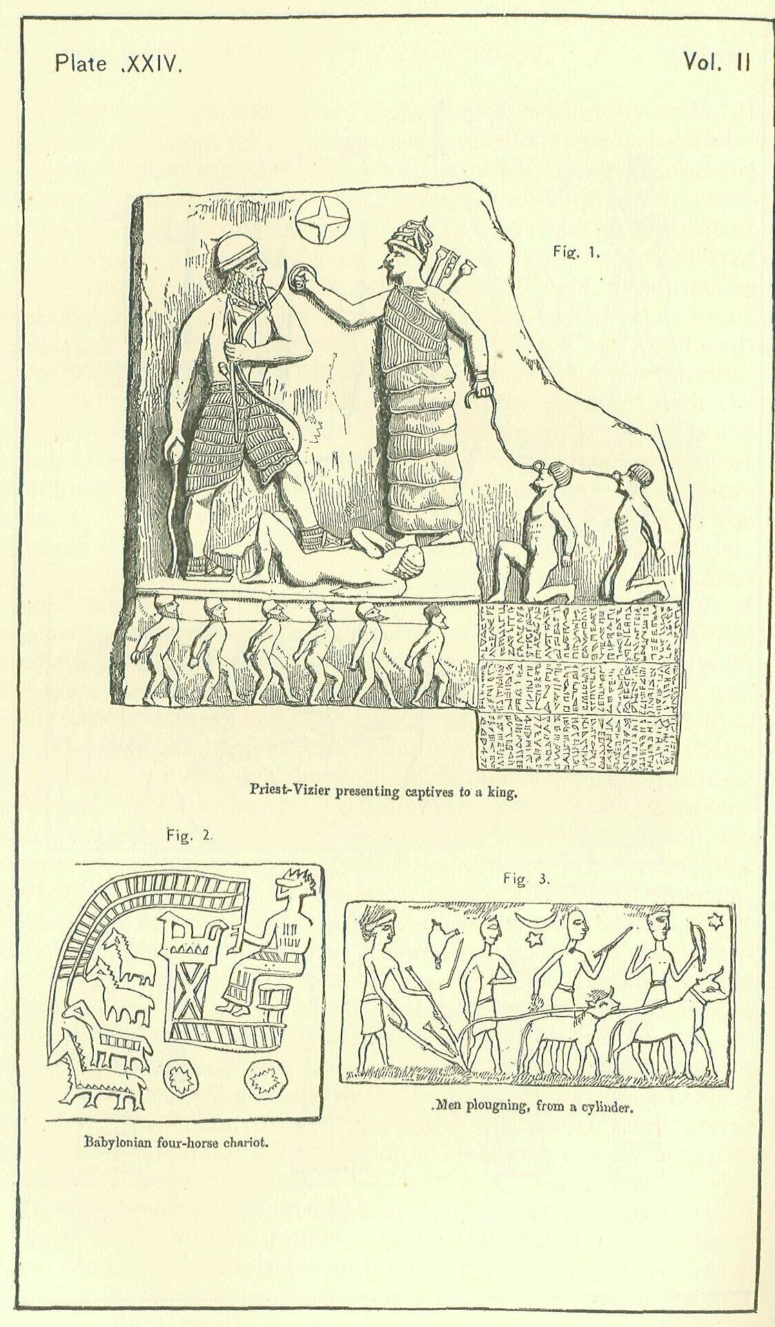 For the cultivation of grain the Babylonians broke up their land with the plough; to draw which they seem to have employed two oxen, placed one before the other, in the mode still common in many parts of England. The plough had two handles, which the ploughman guided with his two hands. It was apparently of somewhat slight construction. The tail rose from the lower part of one of the handles, and was of unusual length. [PLATE XXIV., Fig. 3.]
